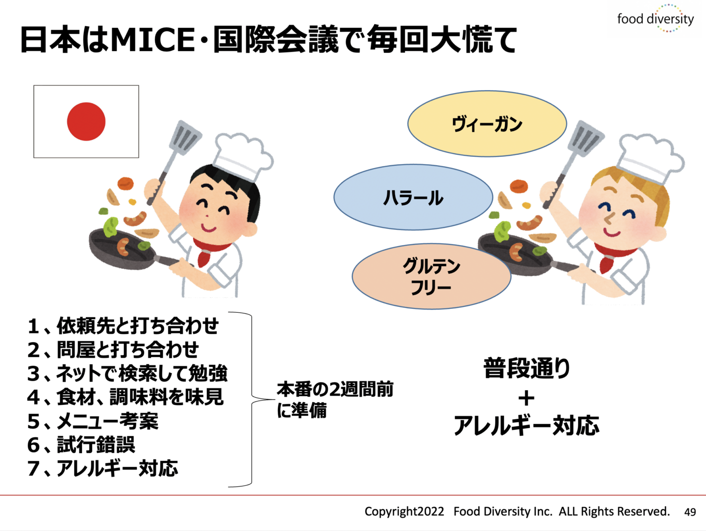 さらに宿泊施設が明日からできる一歩として、朝食で「動物性原材料不使用のカレー」を用意しておき、トッピングでそれぞれ調整する仕組みを作ることなどが事例を踏まえて紹介されました。