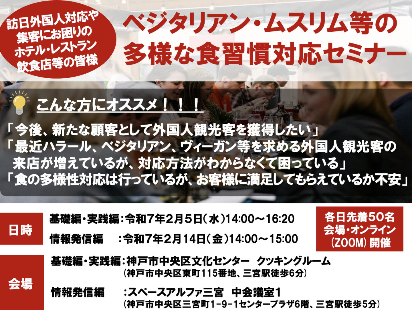 訪日観光客が増加するなか、ベジタリアン、ヴィーガン、ムスリム等多様な食習慣を持つ方々の受け入れに対応するため、兵庫県内でも受入可能店舗が増えることや認知度向上が急務となっています。この度兵庫県では、国内外に向けた効果的な受け入れ環境整備と、情報発信を行うことで兵庫県へのさらなる誘客につなげるため、以下のセミナーを開催いたします。