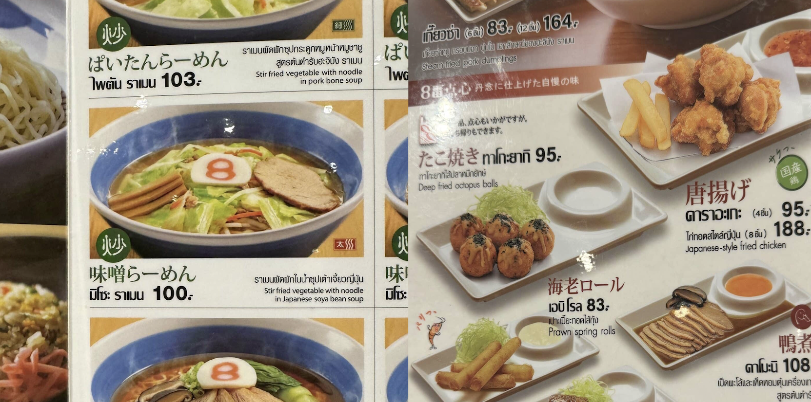 たこ焼きや唐揚げといった料理は日本だと基本的にはサイドメニュー枠ですが、大きく打ち出しをすることで海外の感覚にマッチし、客単価の向上も期待できます。実際海外ではラーメンが100バーツ、たこ焼きや唐揚げが95バーツと、同等の価格で販売されているケースも見られます。