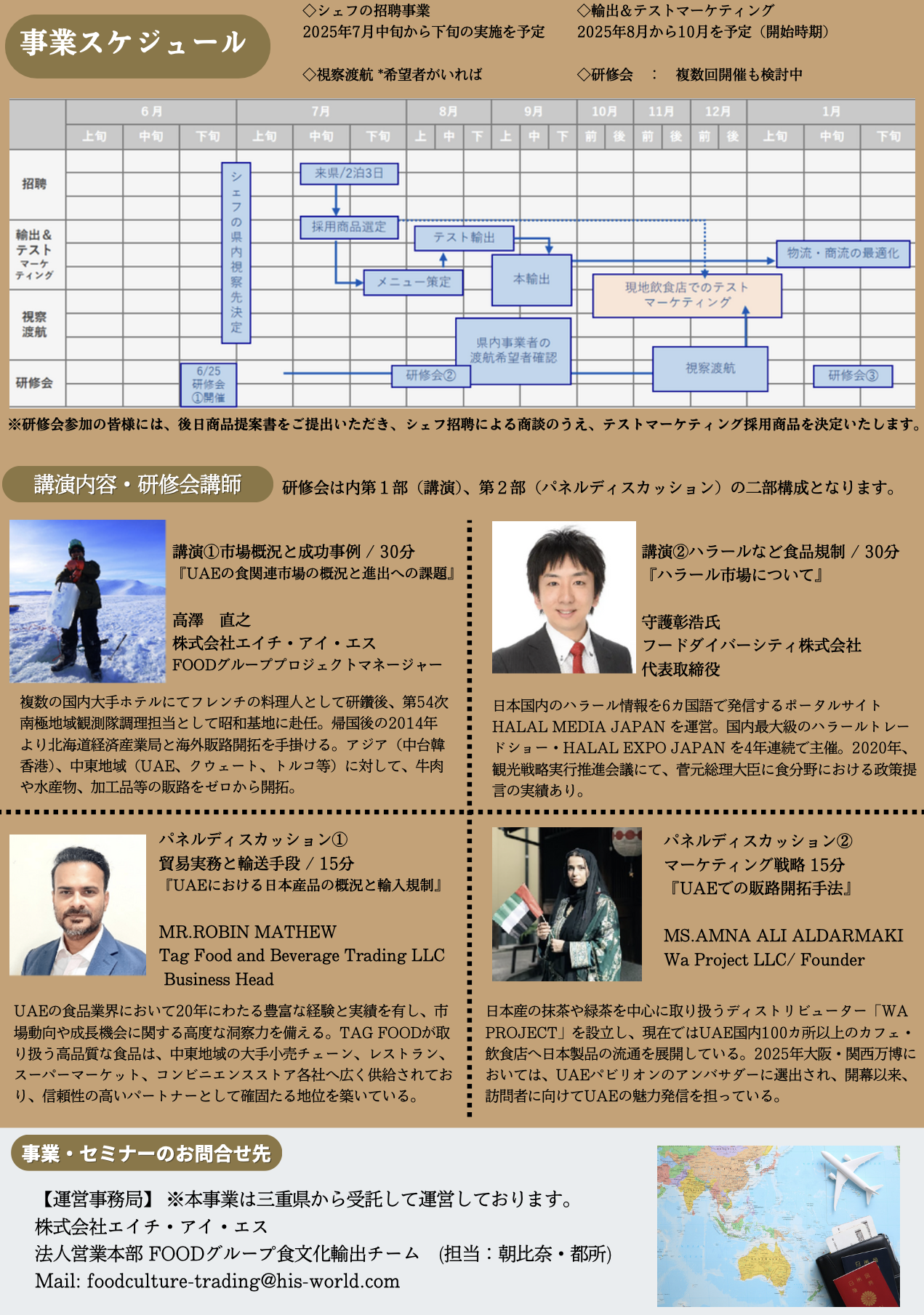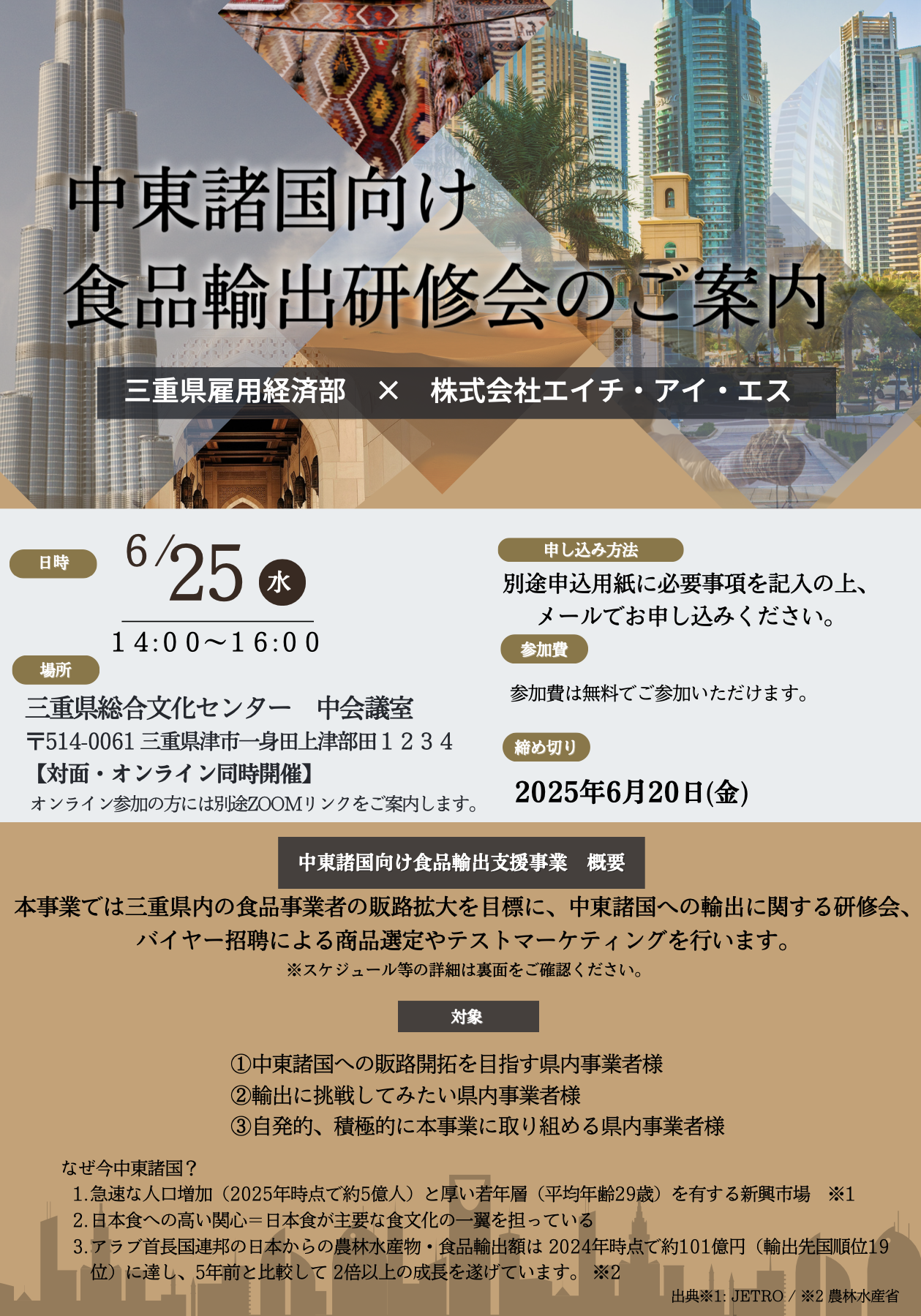 三重県雇用経済部は株式会社エイチ・アイ・エスと連携し、2025年6月25日(水)に「中東諸国向け 食品輸出研修会」を開催する旨を発表いたしました。本研修会ではハラールを含む現地規制や販路開拓の成功事例を紹介し、終了後はUAEなど中東市場への進出を目指す県内事業者の実践支援を行う。