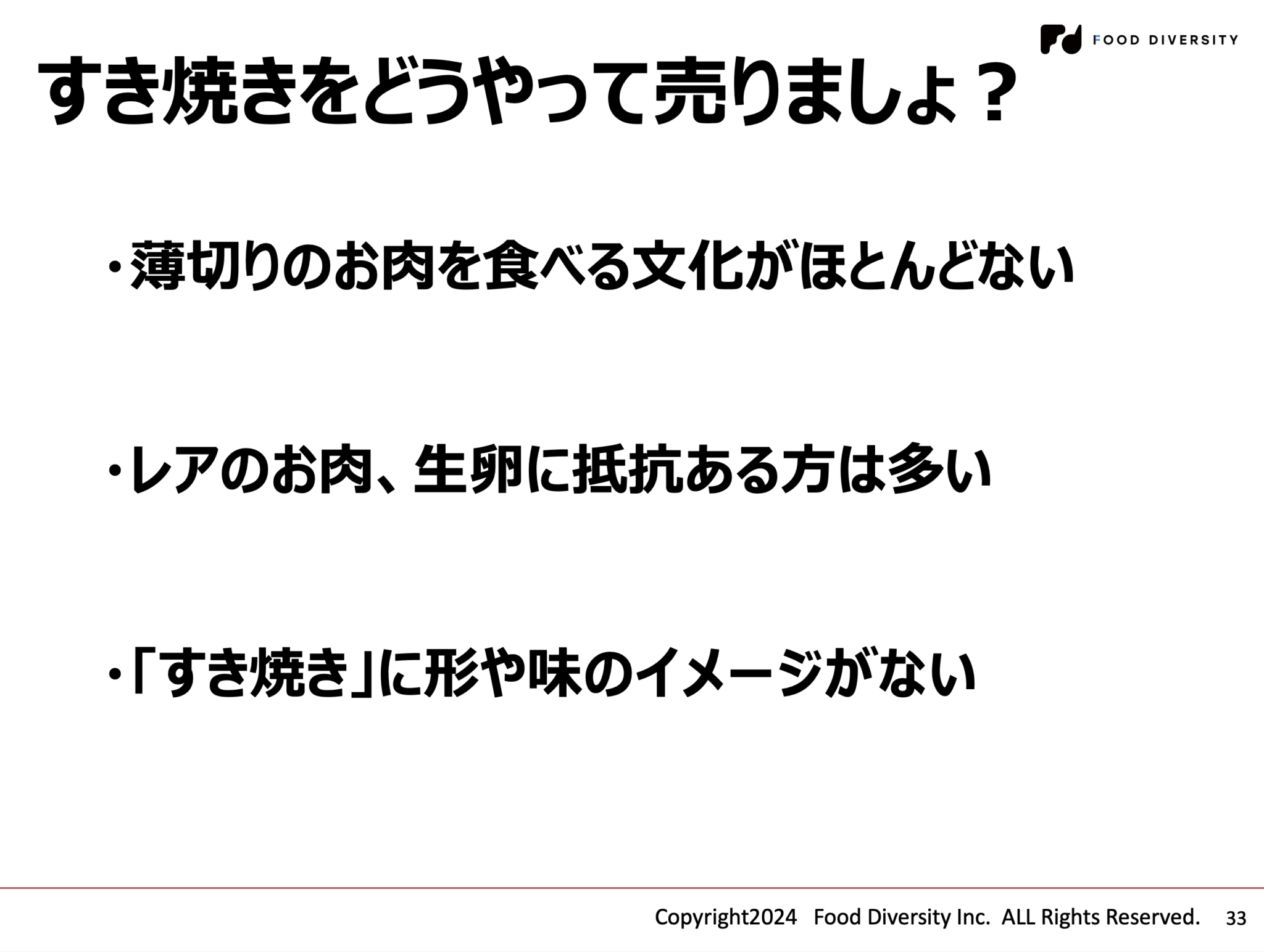 さらに海外での販売においては、「手に取っていただくこと、そして口にしていただくこと」がないと何も起きないので、その仕掛けについて、三重県を代表するグルメ「すき焼き」を事例に説明が行われました。