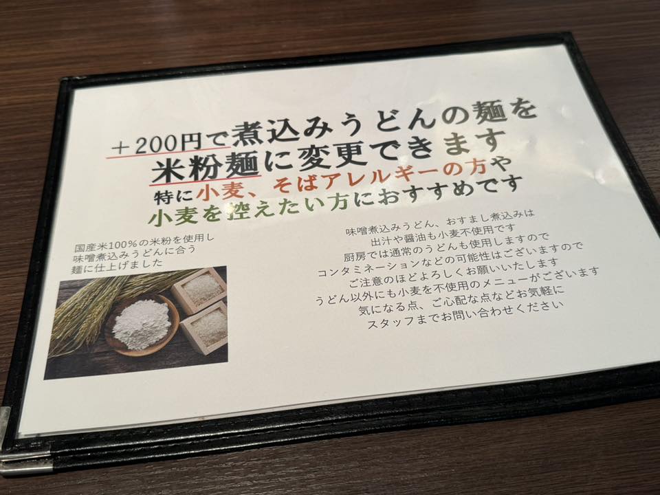 大久手山本屋ではもともと、使用している味噌や醤油もグルテンフリー対応のものを採用しており、麺を含めた全体としても安心感のある構成となっています。