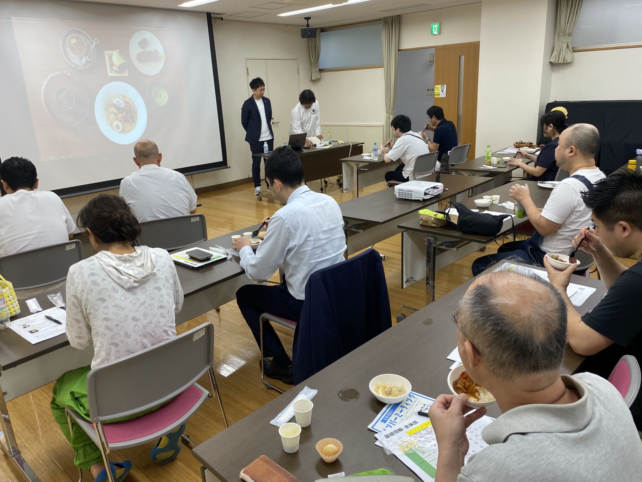 試食の提供後、楠本シェフからそれぞれのメニューにおいて、考え方、使用した原材料や調味料、味を出すための工夫点、売り方など詳細の解説が行われていきました。