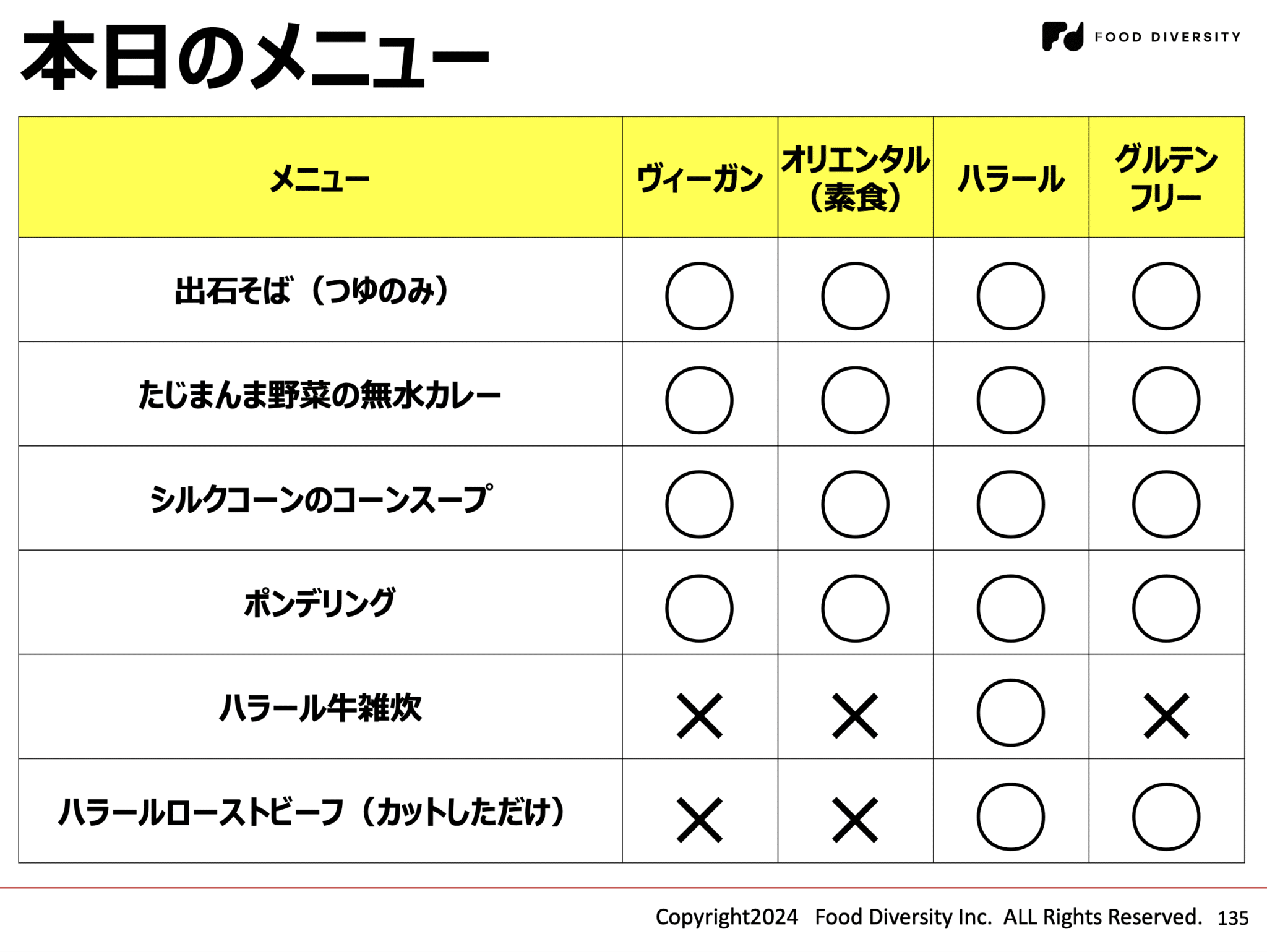 またヴィーガンやハラールなどの分野は「難しそう」と思われがちな分野で、それぞれの専用メニューを作るとオペレーションも含めて大変になりますが、共通点を整理して「みんなが食べられるもの」を一般メニュー化しておくことで、調理現場のストレスが大幅に削減されることが説明されました。