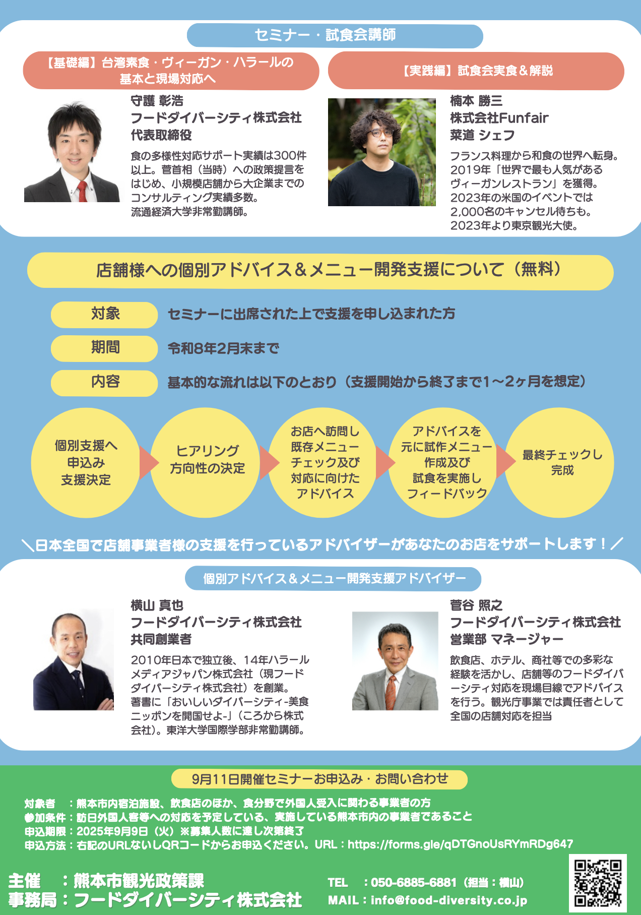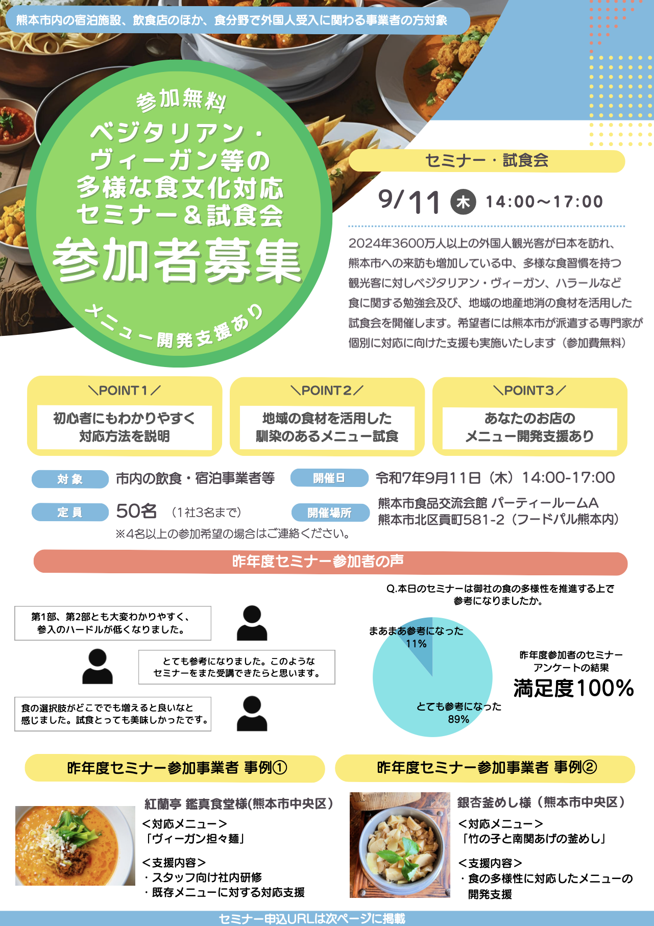 2024年3600万人以上の外国人観光客が日本を訪れ、熊本市への来訪も増加している中、熊本市観光政策課では多様な食習慣を持つ観光客に対しベジタリアン・ヴィーガン、ハラールなど食に関する勉強会及び、地域の地産地消の食材を活用した試食会を開催します。希望者には熊本市が派遣する専門家が個別に対応に向けた支援も実施いたします(参加費無料)