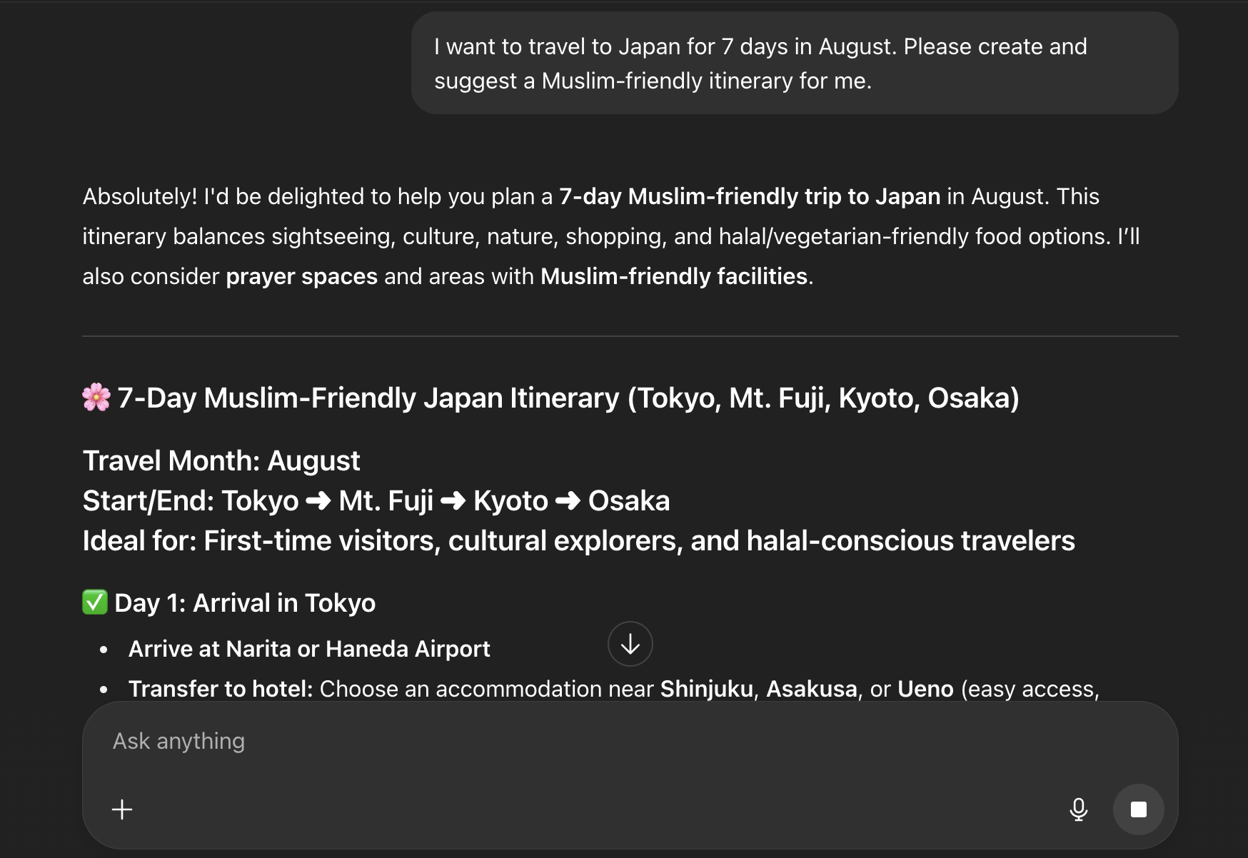 - ハラール食・礼拝スペース・礼拝時間に合わせた日本の文化体験など、ムスリム旅行者に必要な要素を考慮し、AIが個別に旅程を提案