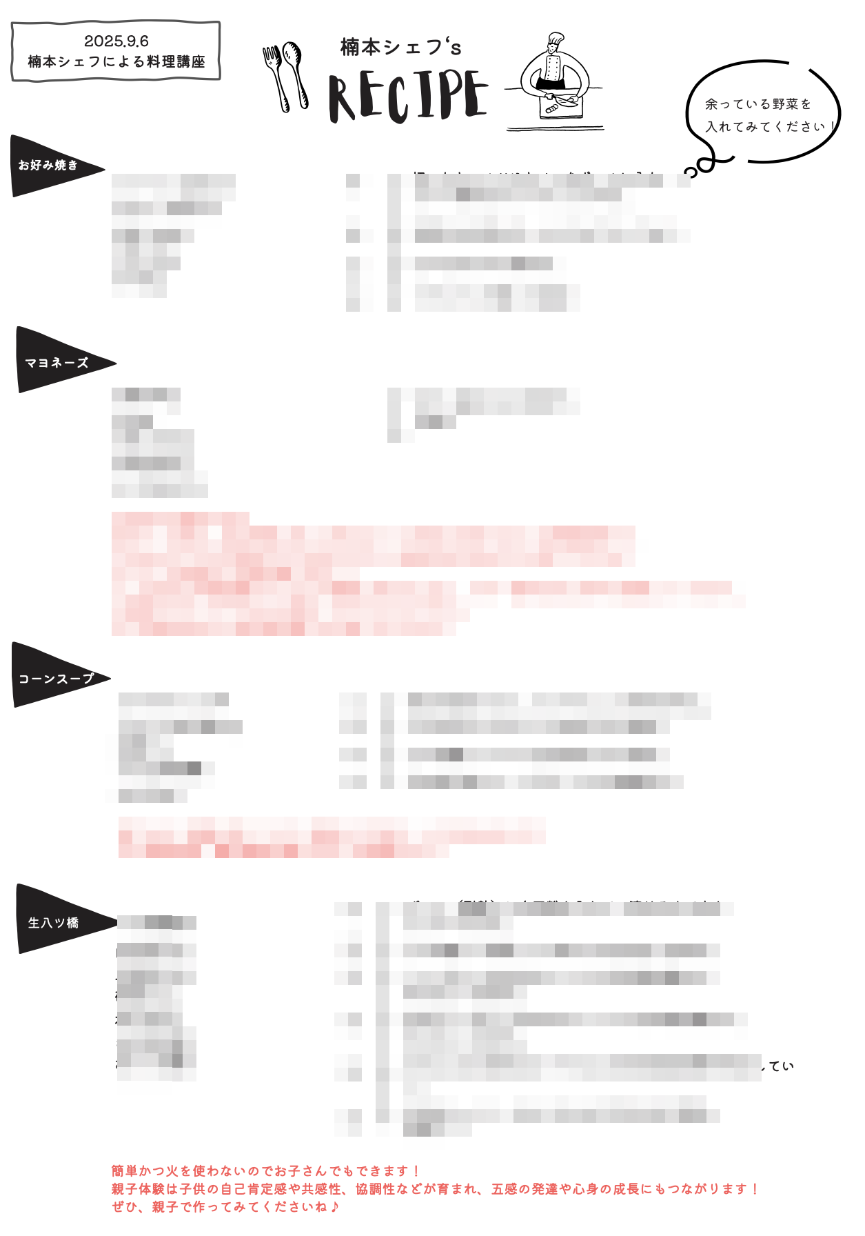 今回楠本シェフが紹介したメニューは「お好み焼き」「マヨネーズ」「コーンスープ」「生八ツ橋」となり、それぞれ実演を踏まえながら作り方が説明されました。