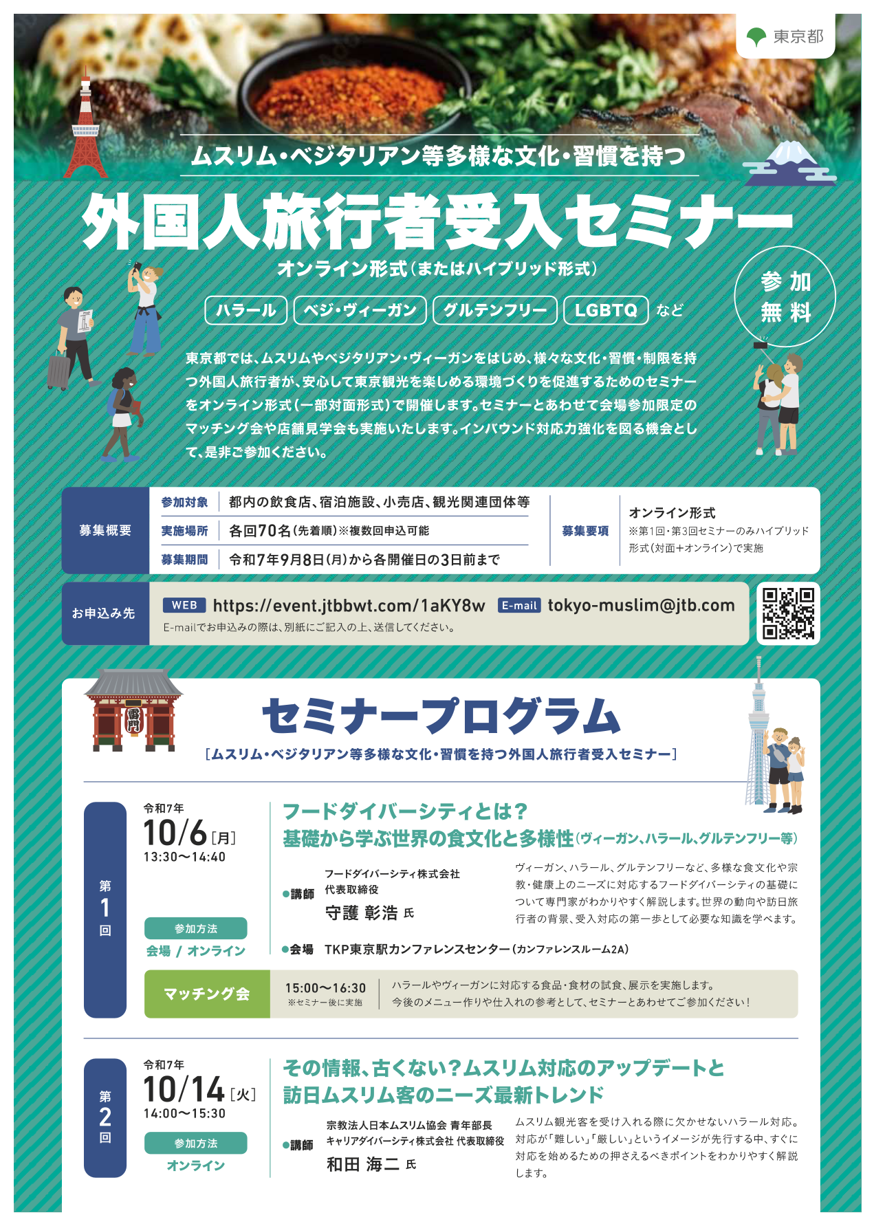 東京都は訪日外国人旅行者の多様な文化・習慣・食ニーズに対応できる体制を強化するため、全8回となる「外国人旅行者受入セミナー」を開催する旨発表いたしました。本セミナーではムスリム、ベジタリアン、ヴィーガン、グルテンフリーなど、食に関する多様なニーズへ対応する基礎知識と実践のヒントを提供します。なお、セミナー後にはマッチング会や店舗見学会も実施され、参加者にとって実地で学べる貴重な機会となります。