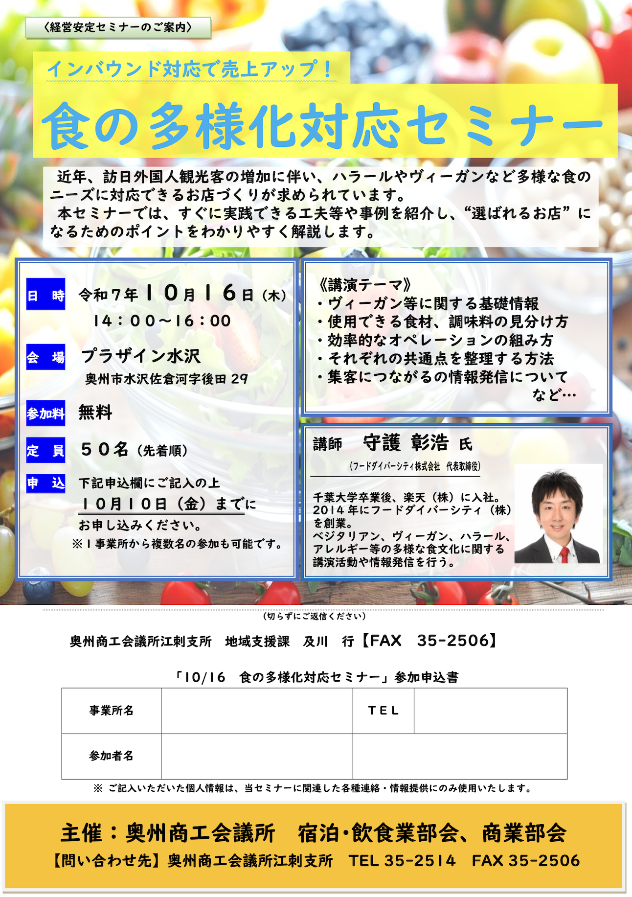 岩手県・奥州商工会議所では、近年増加している訪日外国人観光客のニーズに対応するため、ヴィーガンやハラールなど、多様な食文化に配慮したお店づくりを支援するセミナーを開催いたします。本セミナーでは、実際に役立つ工夫や事例を紹介し、“選ばれるお店”になるためのポイントをわかりやすく解説します。