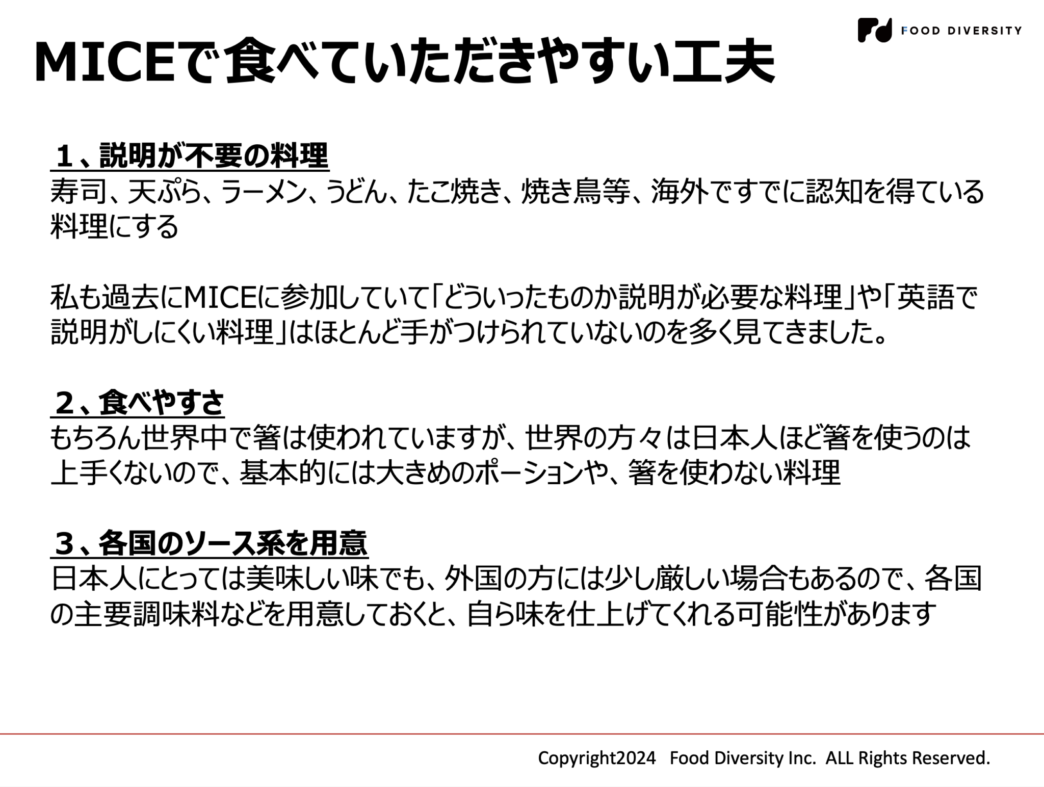 それに付随して、「さしすせその選び方」や「食で喜ばれる工夫」についても説明があり、多様な国や文化の人が集まるMICEでは、オペレーションの簡素化だけでなく、食べていただくための工夫が大切であると紹介されました。