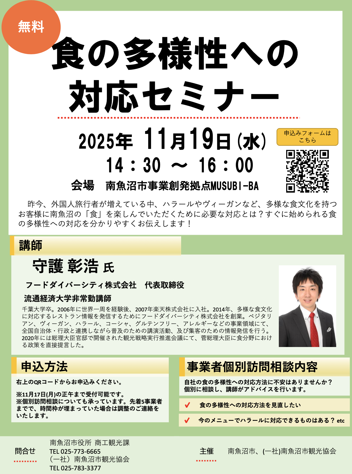また、セミナーの他、希望者には事業者個別訪問相談を行います。現在の食の多様性への対応方法の見直し、今のメニューに対応できるものがあるかなど、講師に直接相談できます。ぜひ奮ってご参加ください。