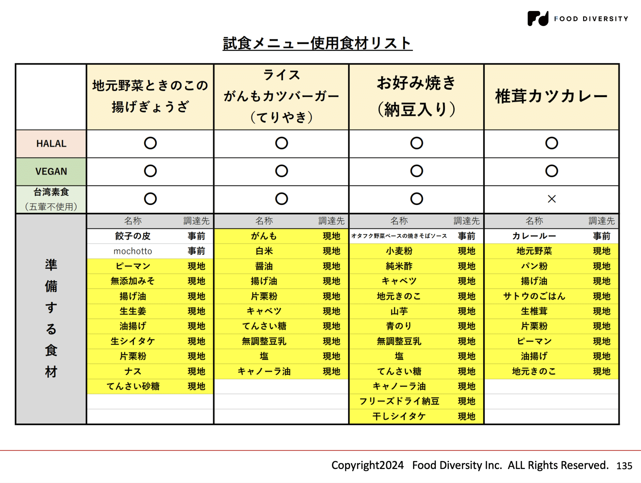 ・フードダイバーシティに対応する場合でも、食材、調味料はほとんどが地元スーパーで揃えることができる