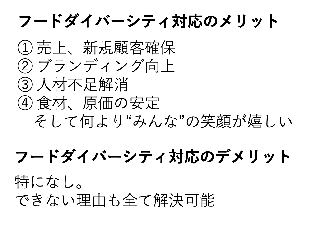 続いて青木氏は「フードダイバーシティ対応してよかったこと」として7項目を上げ、それぞれについて実例を交えて解説しました。