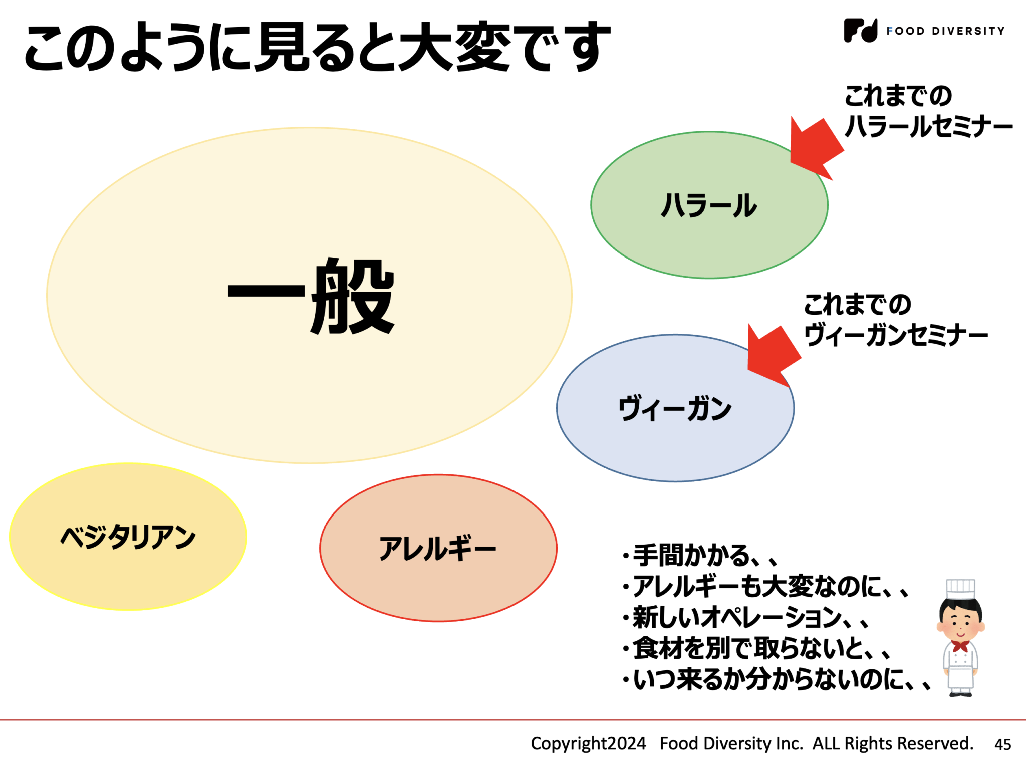 ヴィーガンやハラールなどは一見「難しそう」と思われがちな分野ですが、専用メニューを個別に作成するとオペレーションの負担が大きくなります。そこで、共通点を整理し「みんなが食べられるもの」を一般メニューとして標準化することで、調理現場のストレスを大幅に軽減できることが示されました。