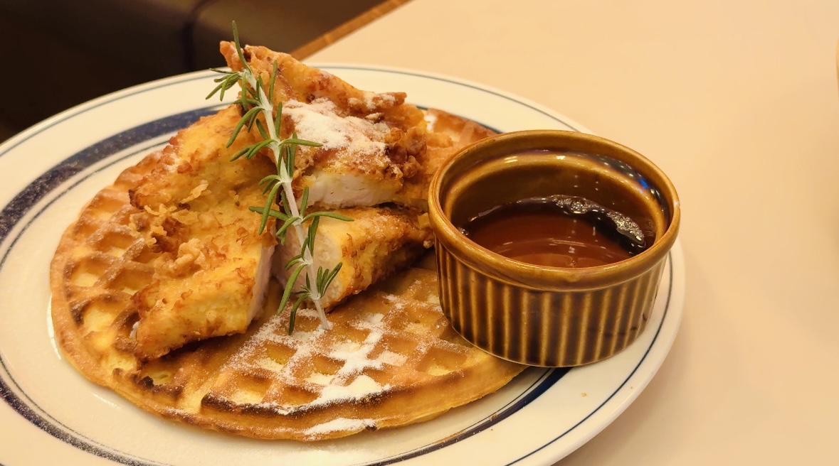 サクッと揚げたチキンと、ふんわりワッフルにメープルシロップ。