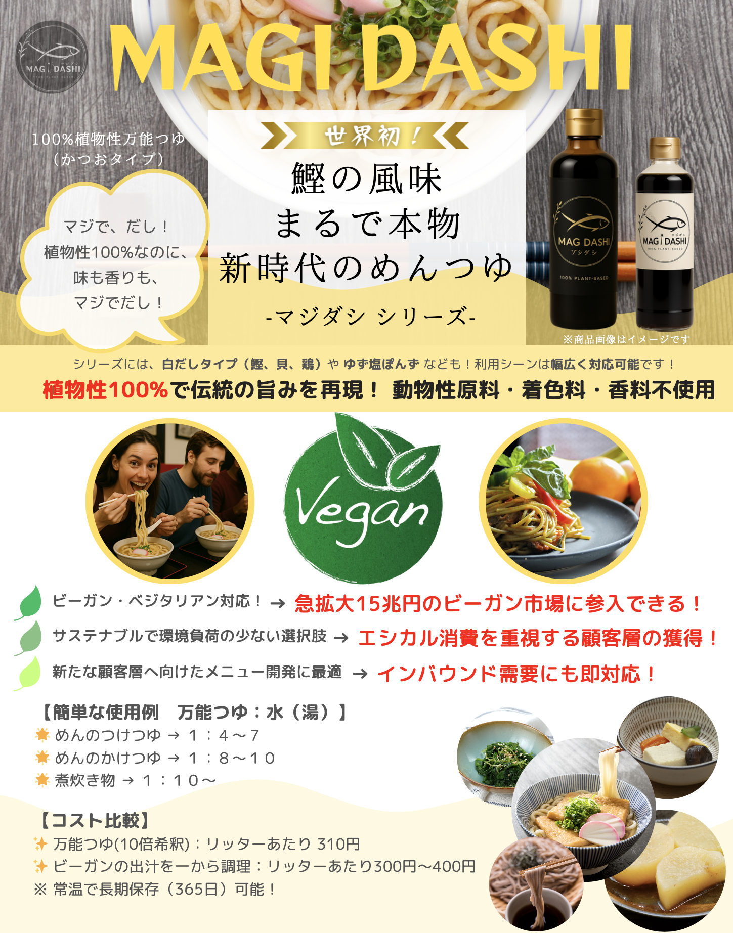 これまで、動物性原料を使わずにカツオ出汁の深い旨味を作ることは難しく、外食店がヴィーガン対応メニューを作る際の大きな障壁になっていました。しかしMAGI DASHIは、独自製法によって香り・旨味・余韻まで「まるで本物のカツオ出汁」を実現し、発売直後からSNSや飲食関係者の間で大きな話題となっています。