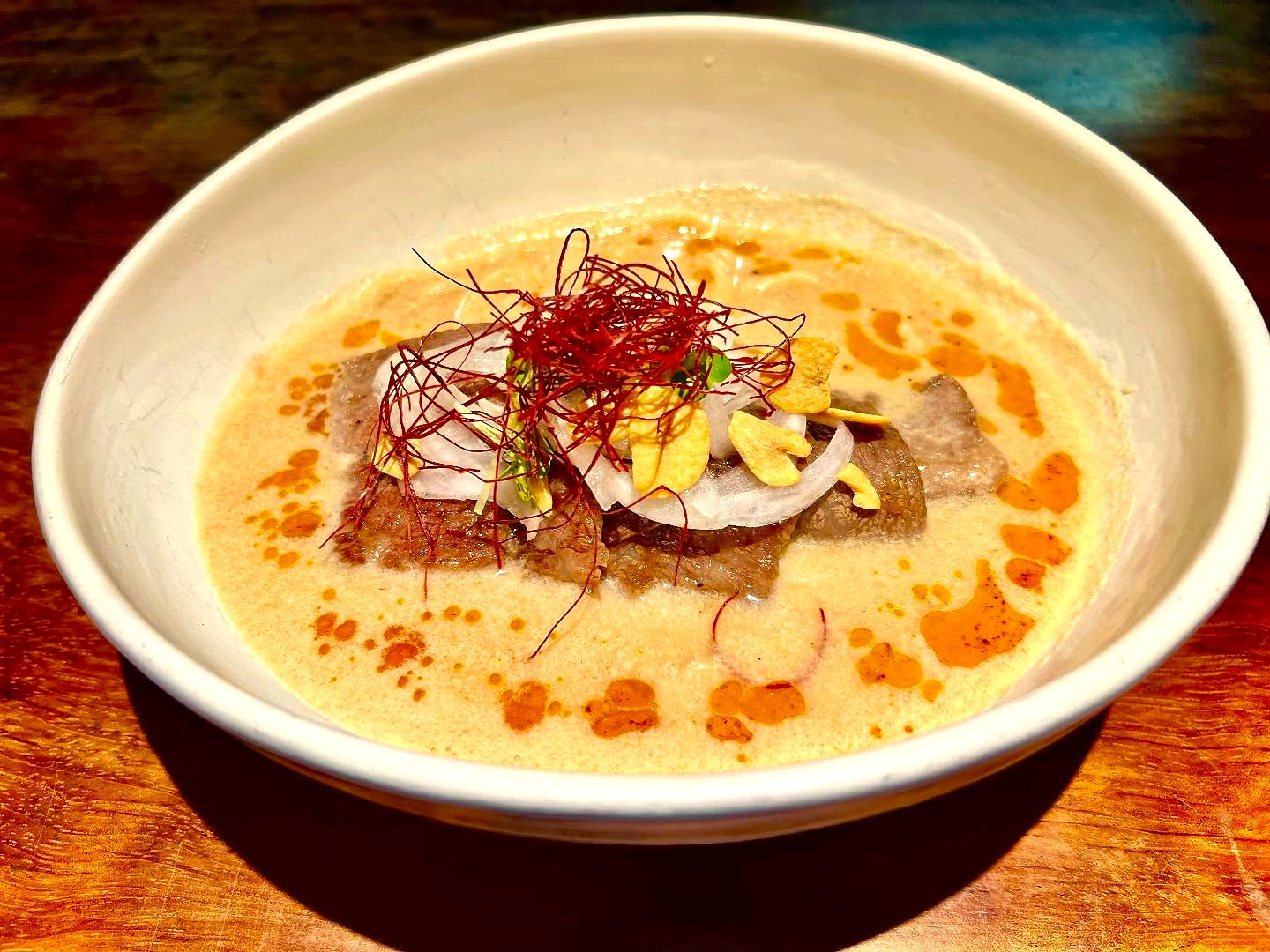 居酒屋ごん太が開発したハラール和牛ラーメンは、厳選された極上のハラール和牛を贅沢に使用。スープに溶け込む肉の旨味は濃厚そのもので、一口食べればとろけるような柔らかさと深い味わいが口いっぱいに広がります。