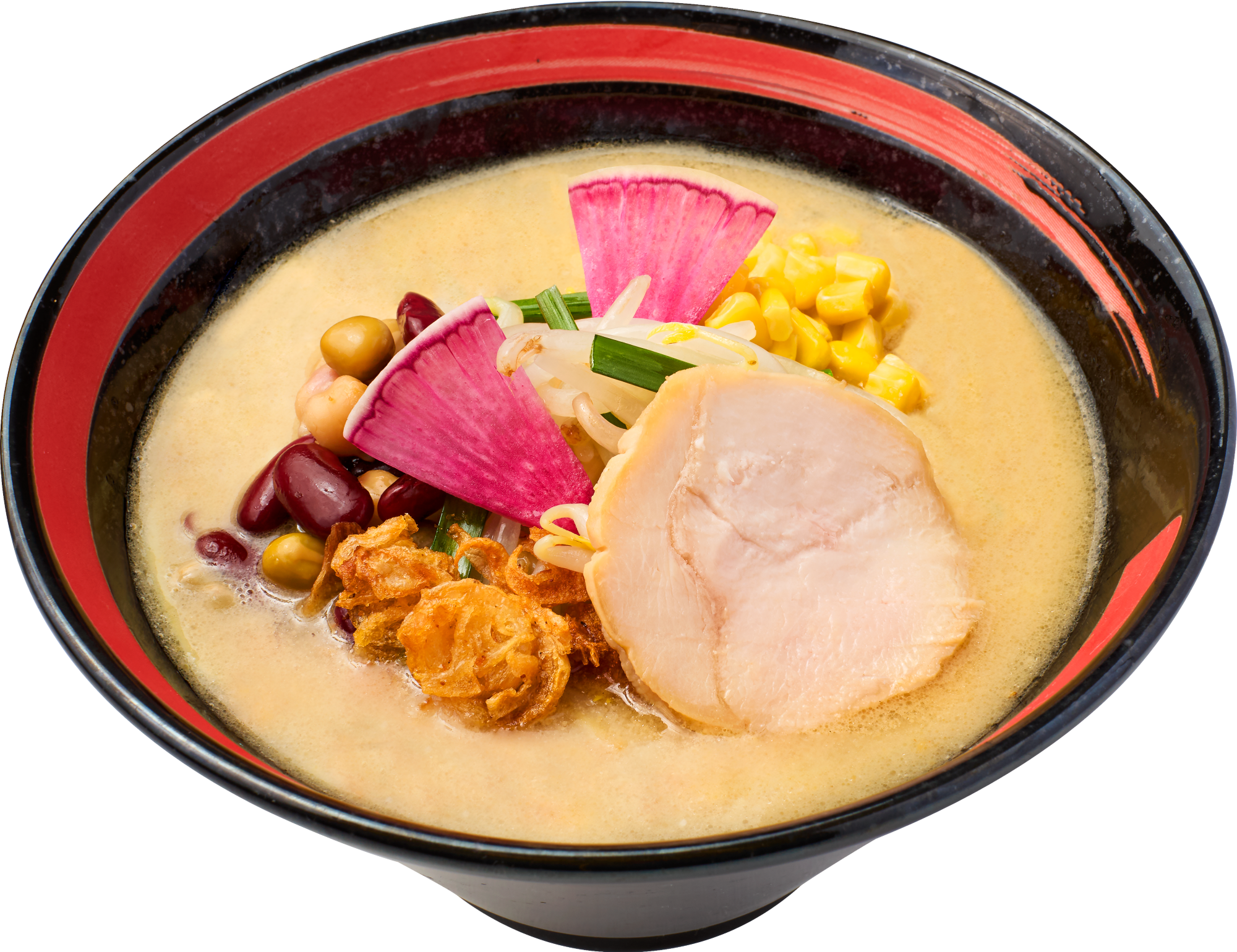 味噌味の「彩」は、味噌の深いうま味と彩り豊かさを表現したバランスの一杯。ハラール認証味噌を使用し、甘口でまろやかな味わいに仕上げました。トッピングは、鶏胸チャーシュー・紅芯大根・ミックスビーンズ・コーン・フライドオニオン・もやし・ニラの7種類の具材が生む彩りと食感が楽しめます。