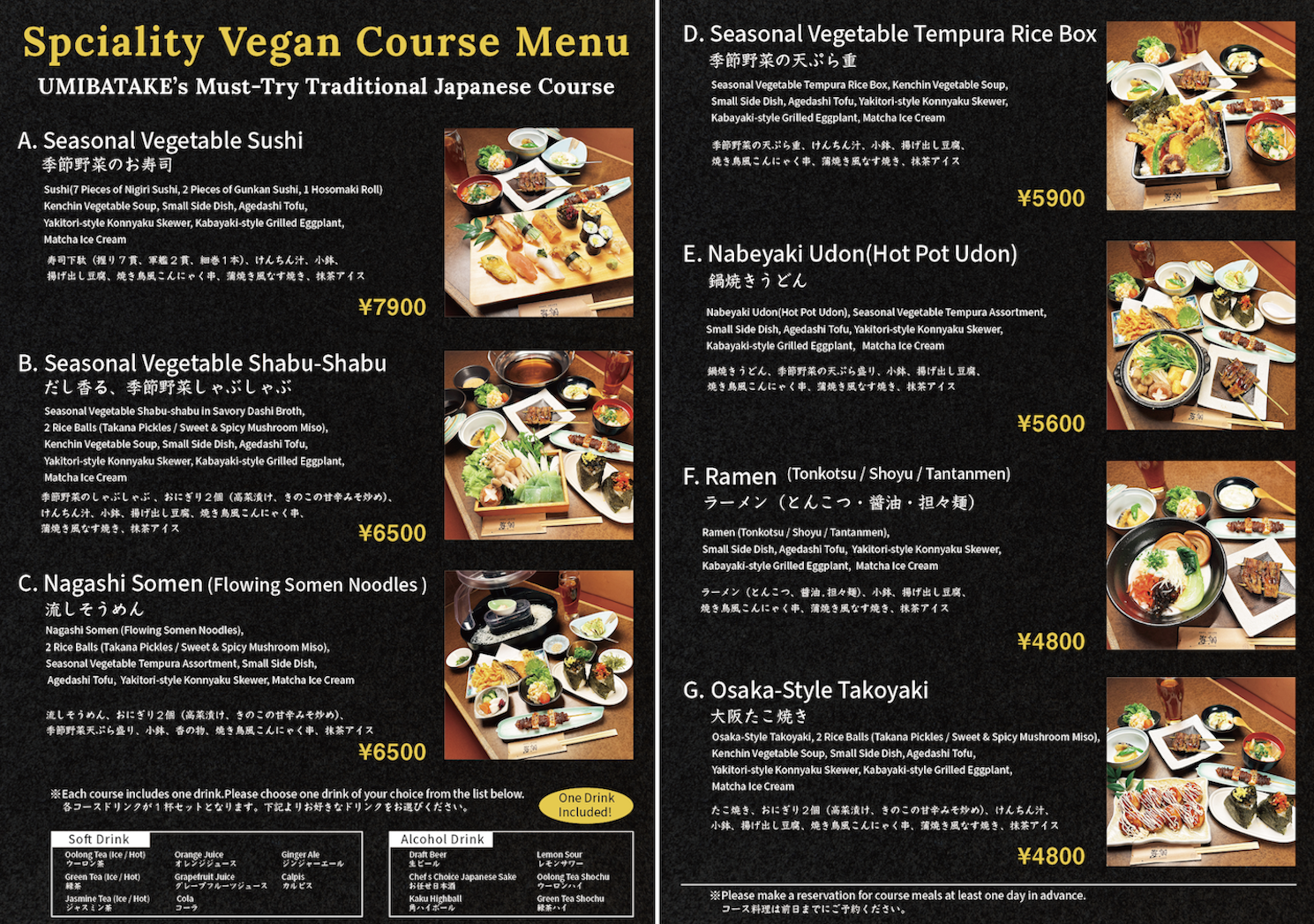 コースメニューでは、「季節野菜のお寿司(7,900円)」をはじめ、「だし香る 季節野菜のしゃぶしゃぶ(6,500円)」「流しそうめん(6,500円)」「季節野菜の天ぷら重(5,900円)」「なべ鍋焼きうどん(5,600円)」など、日本らしさと季節感を大切にした料理を用意。また、ヴィーガン対応の「ラーメン(とんこつ/醤油/担々麺)」や「大阪 たこ焼き」といった、海外ゲストにも人気の高いメニューも取り入れており、幅広いニーズに応える内容となっています。前日までの予約制。