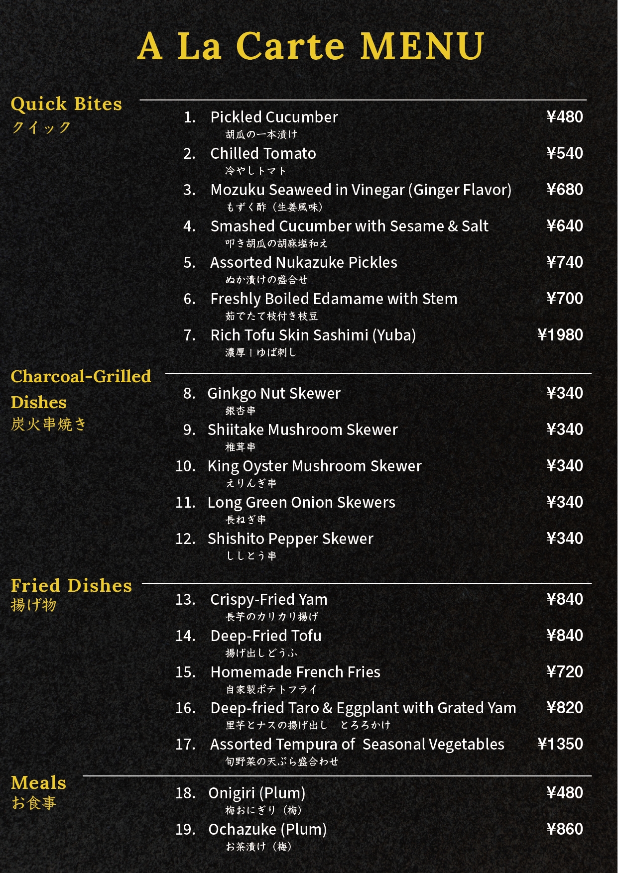 今回販売開始されたヴィーガンメニューは、アラカルトおよびコースの両方を取り揃え、個人での利用から団体での利用まで、幅広いシーンに対応できる内容となっています。