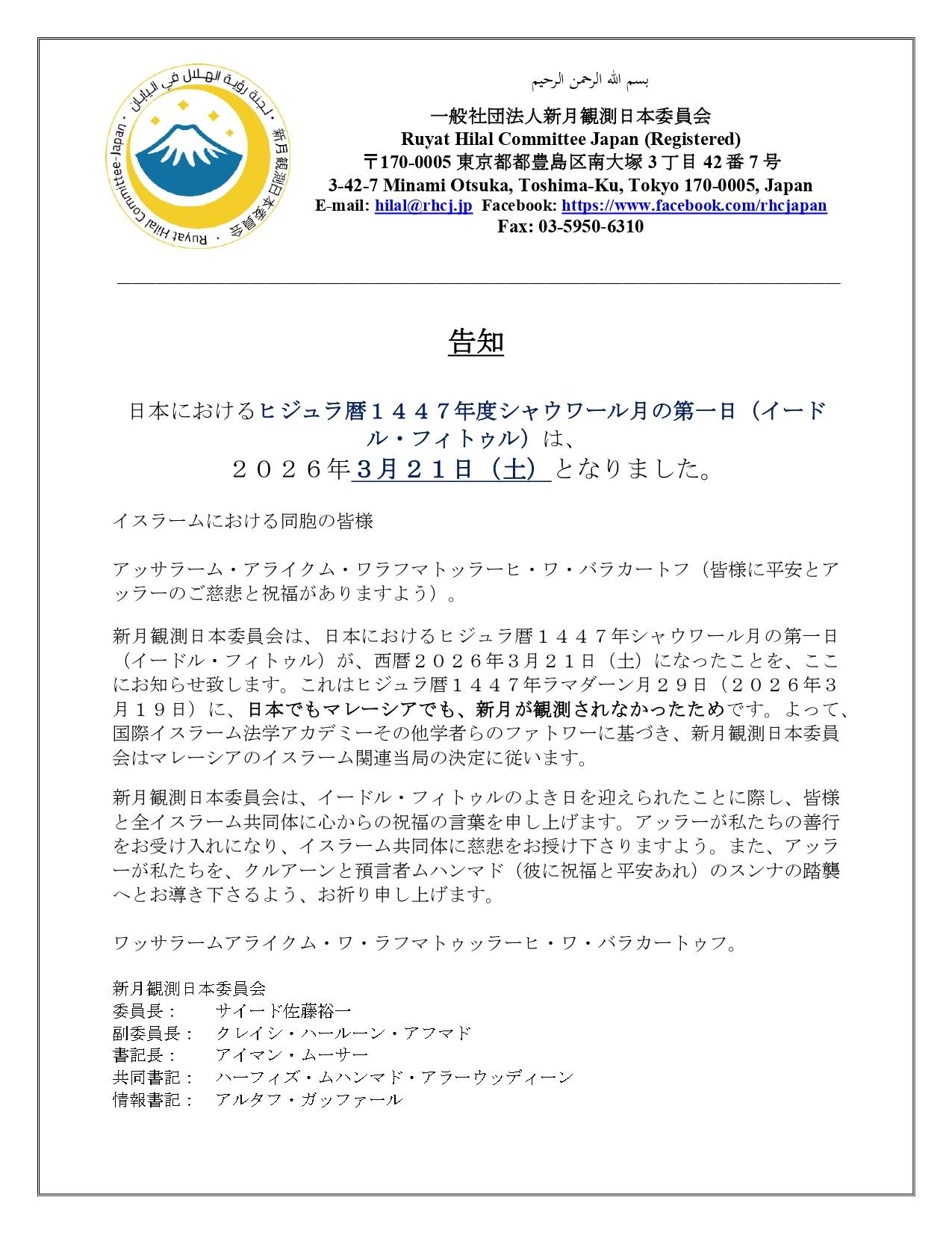 2026年3月19日、新月観測日本委員会(Ruyatl-e-Hilal Committee-Japan)は、日本におけるヒジュラ暦1447年度シャウワール月の第一日(イード・ル・フィトル)は、2026年3月21日(土)となったことを発表いたしました。