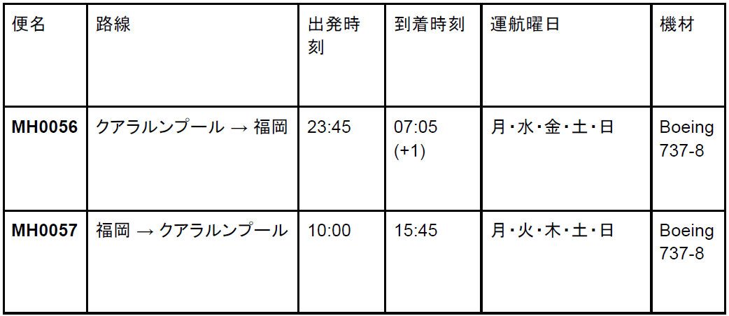 運航スケジュールは、福岡発が月・火・木・土・日曜の午前10時で、クアラルンプールには午後3時45分(現地時間)に到着。クアラルンプール発は月・水・金・土・日曜の午後11時45分(同)で、福岡には翌日午前7時5分に到着する。