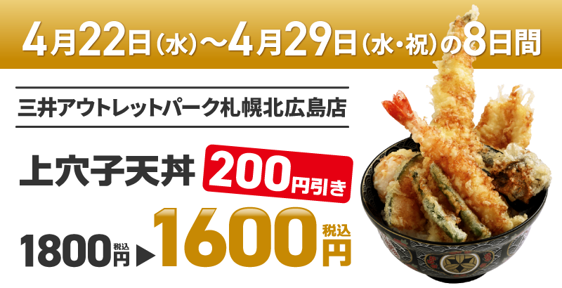 この度オープンを記念して、「三井アウトレットパーク 札幌北広島店」にご来店いただいたお客様には、『上穴子天丼』を税込価格から200円割引で販売いたします。