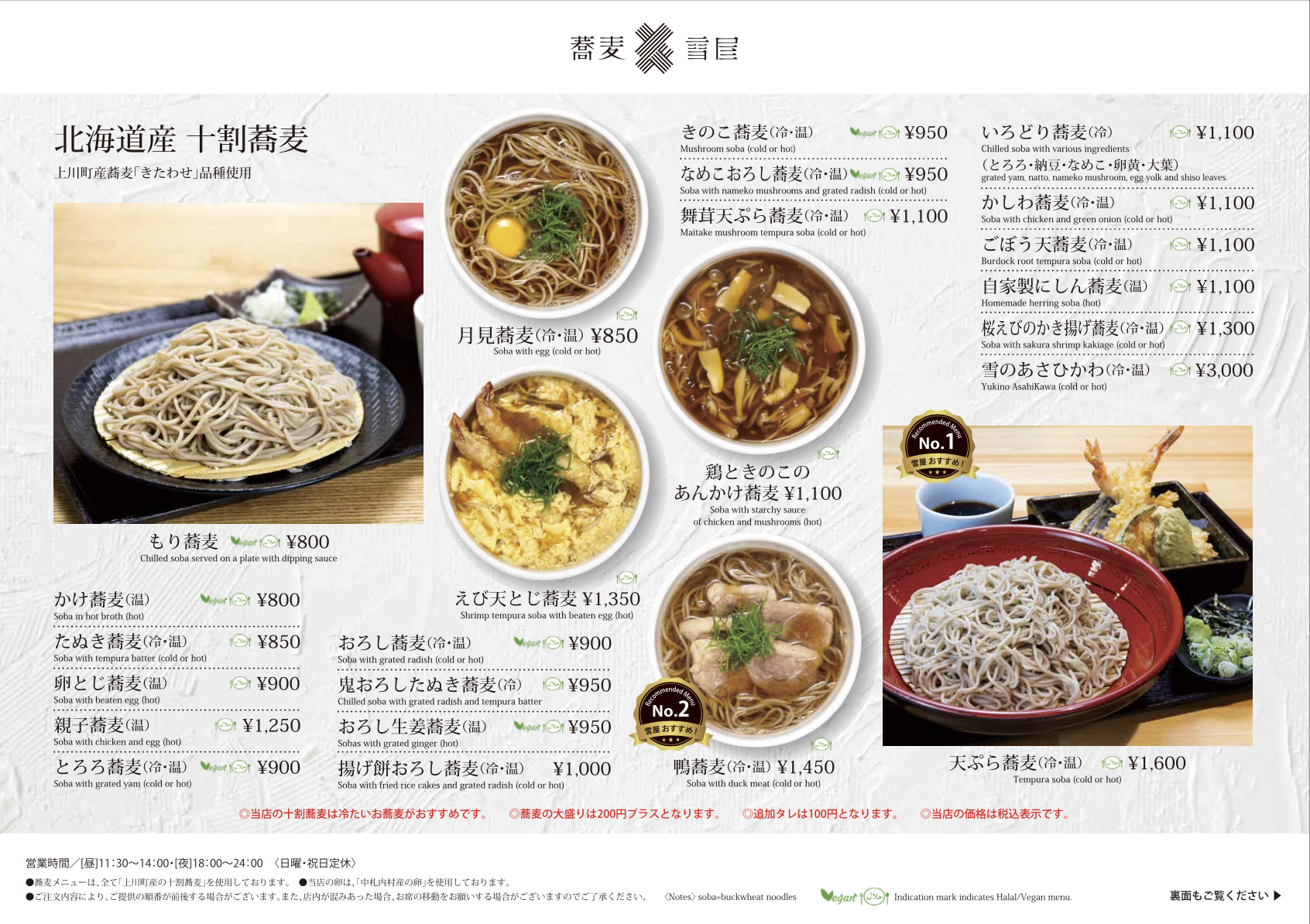 Soba Yukiya serves juwari soba (十割蕎麦), made entirely with buckwheat flour from Kamikawa Town in Hokkaido. These gluten-free noodles have a rich, nutty aroma and are a regional specialty. Even the soba tea (韃靼そば茶) served here is made from Hokkaido-grown tartary buckwheat and is free from any animal-derived ingredients.