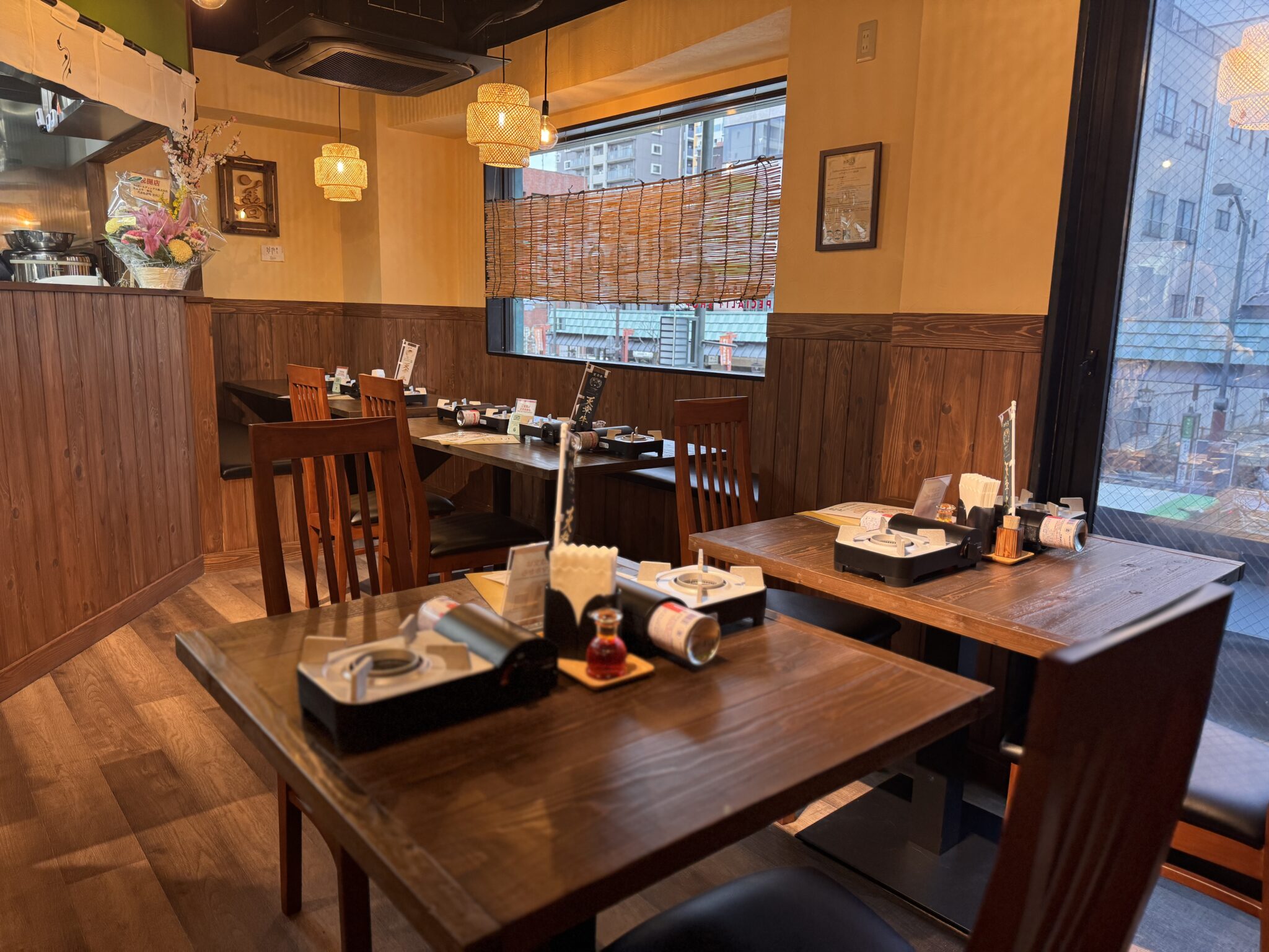 Inside, wooden tables and chairs create a cozy, welcoming atmosphere. Each table is equipped with a built-in hot pot stove, allowing guests to enjoy their meal at an unhurried pace in a calm and comfortable space.