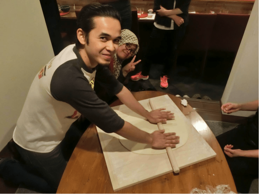 If you are scared to use the knife, the staff will help you out. After finish cutting the dough, the staff will boil the noodles and fry Tempura too!